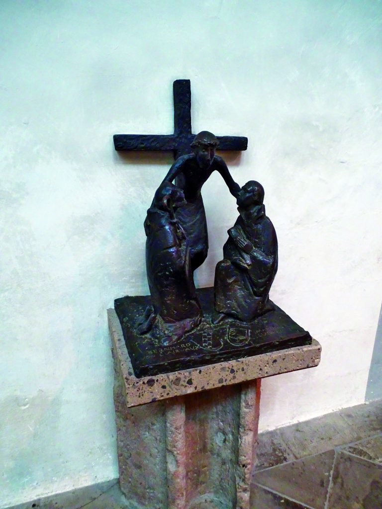 Der Altenberger Dom überstand im Laufe der Jahrhunderte etliche Krisen. 1349 starb ein Drittel der Bevölkerung im Rheinland an der Pest, 1815 wurden die meisten Bauten der Abtei und das Dach des Doms durch einen Brand der mittlerweile als chemische Fabrik dienenden Klostergebäude zerstört. Durch Witterungsschäden stürzten Anfang 1830 dann das südliche Querschiff und die Gewölbe von Vierung und Chor ein. Ein kompletter Einsturz wie bei Notre Dame in Paris blieb dem Gotteshaus aber erspart. Die Bronzeskulptur von Werner Franzen symbolisiert die Ökumene. „Als Karl Friedrich Schinkel, der Baumeister des Preußischen Königs, die Schäden inspizierte, bezeichnete er den Altenberger Dom als „ganz vollendet schön“ und bat König Friedrich Wilhelm III. um Unterstützung“, berichtet Gert Tröger weiter. Bevor die Kirche einstürzen konnte, bewilligte der König insgesamt etwa 20.000 Thaler, sein Sohn Friedrich Wilhelm IV. ließ das Gotteshaus wieder vollständig wiederherstellen.
